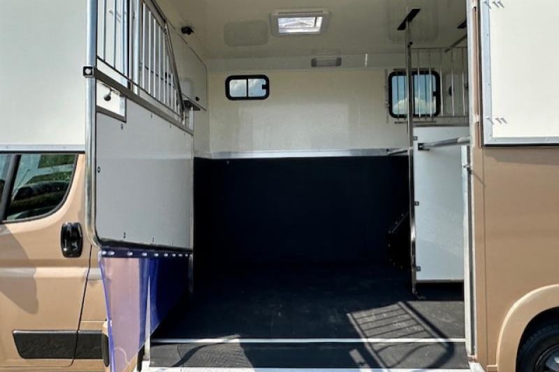 This 2020 Citroen Relay Sterling Pro 3.5t horsebox combines elegant design with practical features, boasting a full wall between the horse and changing area, air-conditioned cab, and CCTV. Finished in metallic gold, it offers rear-facing stalls, an 8ft internal height, sealed rubber flooring, and smart living touches like dual seating and tack storage.