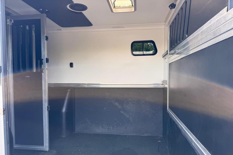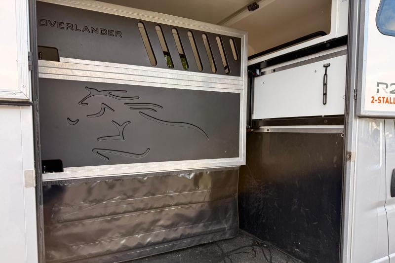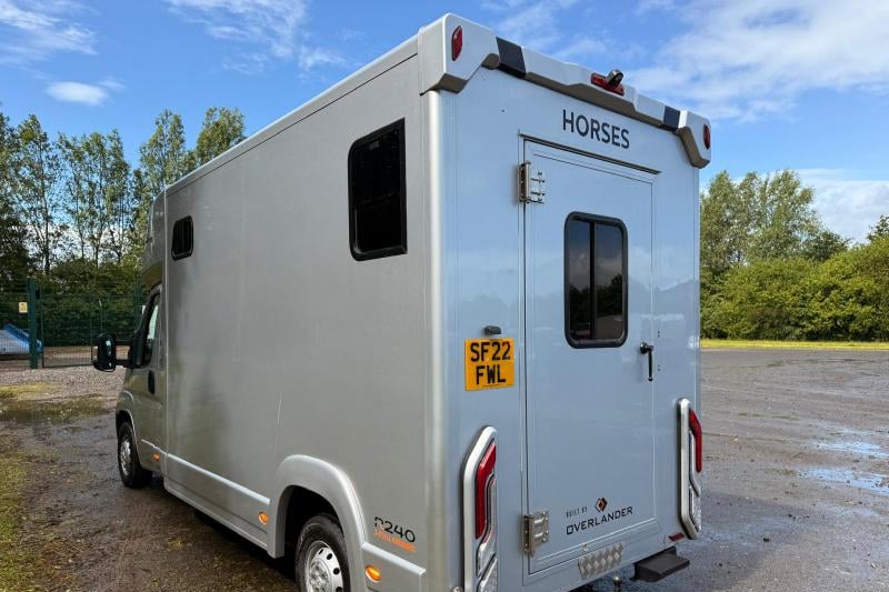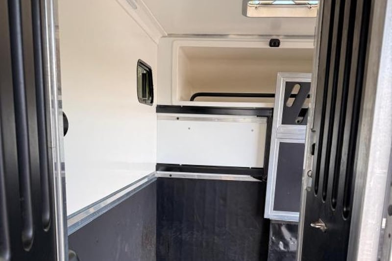 This professional-grade horsebox offers a thoughtfully designed layout, including a full-height wall separating the horse and changing areas, and is stalled for two rear-facing horses. Features include air conditioning, CCTV, cruise control, leather seating, and a well-equipped tack area. The horse area boasts padded partitions, aluminium flooring with drainage, and excellent ventilation. Finished in metallic silver with external tie rings, ferry lashing points, and a tow bar.