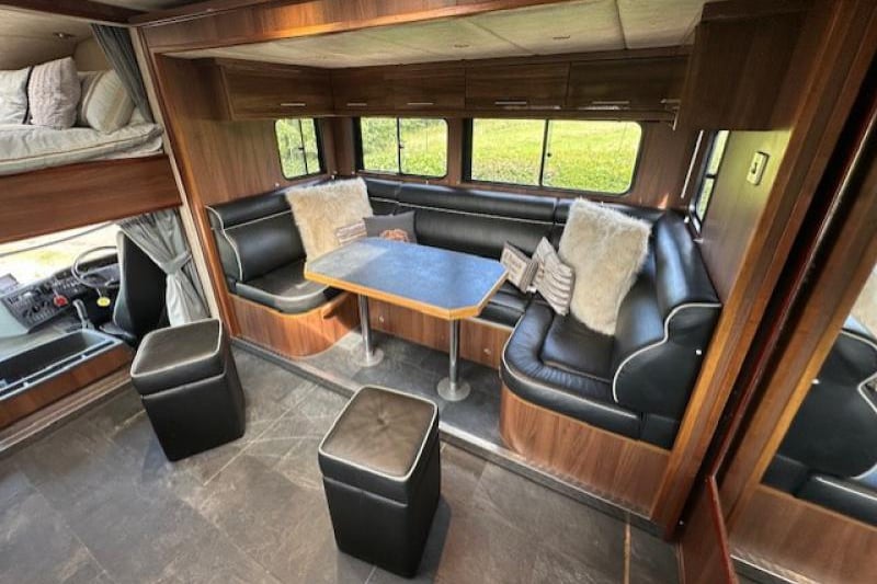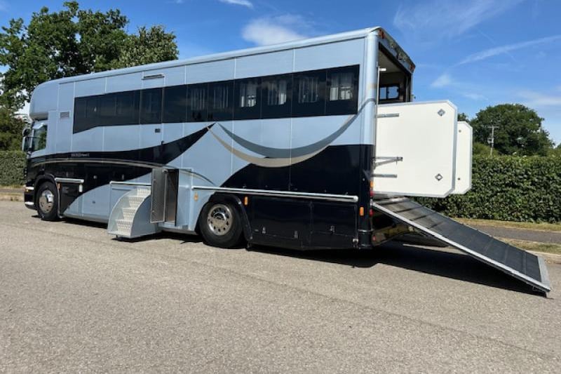 2006 Scania 230 18T Maudsley (Majestic) horsebox, stalled for 4 with powered ramp and superb ventilation. Luxurious living with slide-out sleeps 6, full kitchen, shower room, TV, and mood lighting. Well-equipped cab with CCTV, cruise control, air suspension, and only MOT’d to April 2026. Finished in metallic paint with loads of underfloor storage.