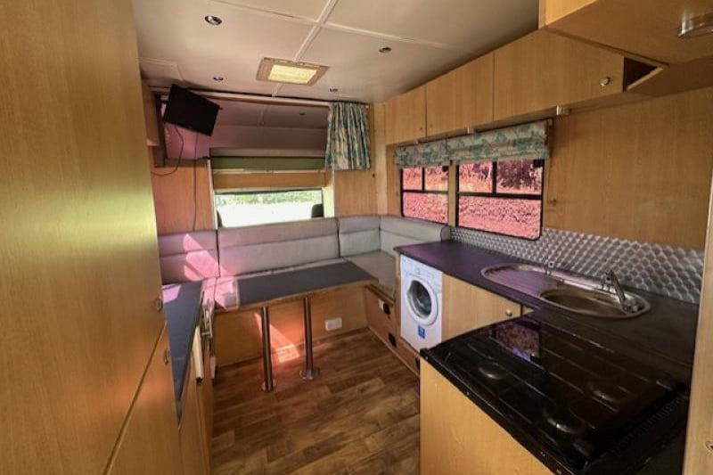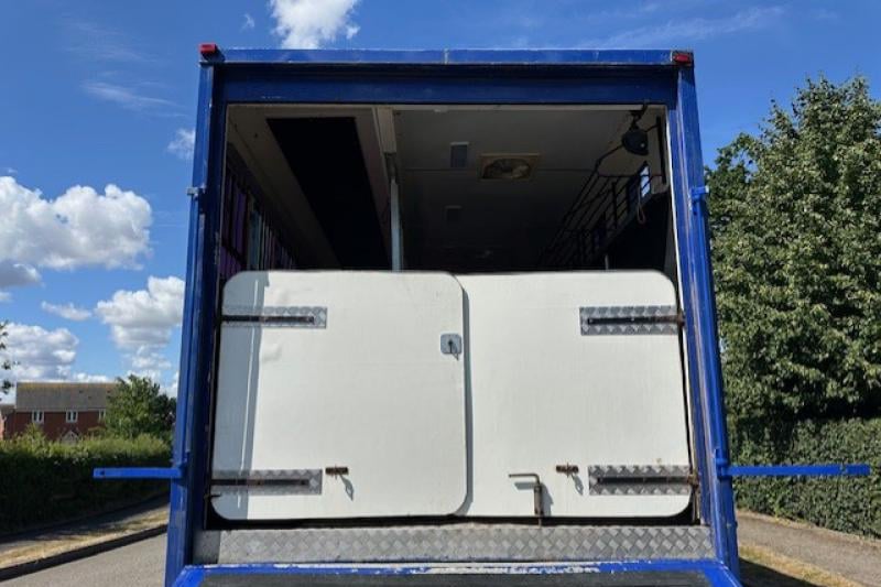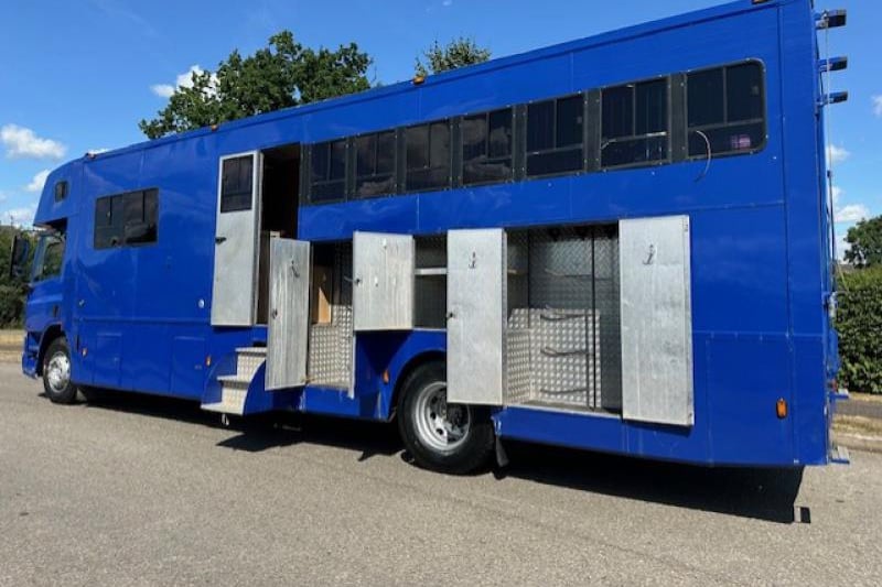This 2002 DAF CF 65 220 18T horsebox by AAquine offers a robust and spacious solution for transporting up to 5 horses in comfort and safety. With only 371,767 miles, it features a smartly finished living area with sleeping for 4, a large Luton, full cooker, fridge, hot water, heating, mood lighting, two TVs, and even a washing machine. The separate bathroom includes a fitted shower with glass door, flush toilet, and ample storage. The horse area is fully equipped with H-style padded partitions, EVA kick boarding, strong anti-slip rubber flooring, electric ceiling fans, and tinted windows with bars. Externally, the box benefits from a smart blue paint finish, multiple tack and skirt lockers, outside horse wash, and 240V hookup.