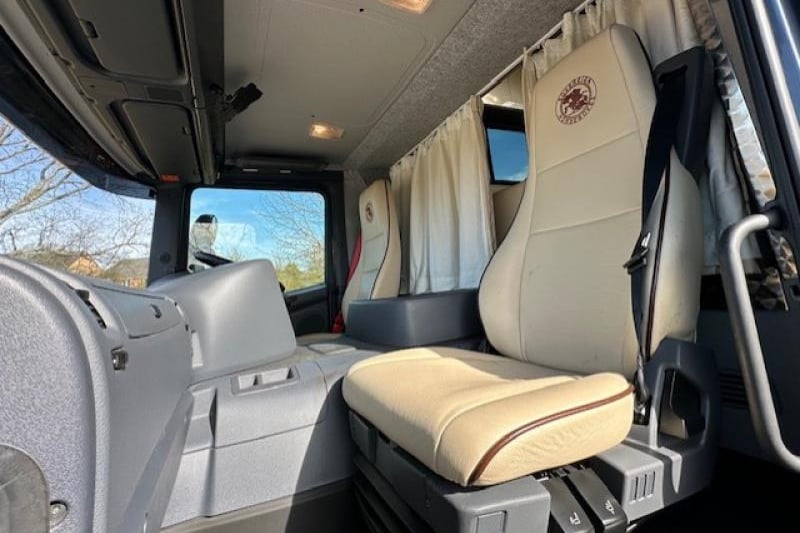 - Leather upholstered cab seating with sovereign logo in the headrests which also have lumber support and adjustment