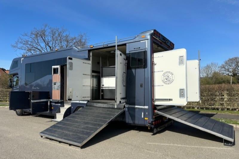 Immaculate 18T Scania P250 (Euro 6) with just 14,562 miles from new. Built by Sovereign Coachbuilders, this high-spec lorry features stalls for four (three forward facing, one herringbone), thermostatic ventilation, aluminum flooring, DEFRA fans, and powered side/rear ramps. The luxurious living space sleeps six, with C-shaped leather seating, granite worktops, Smart TV, blown heating, full kitchen, and a separate shower/toilet room. Includes underfloor storage, diesel generator, and advanced cab features like lane assist, air con, leather seats, and full CCTV.