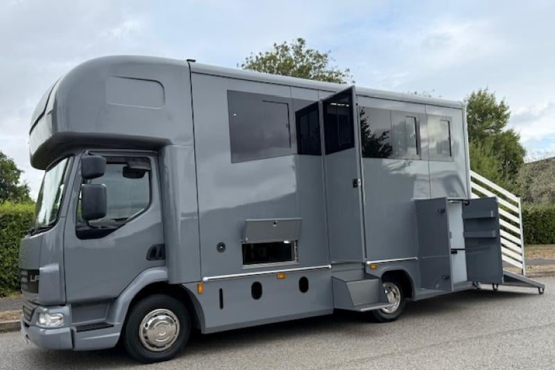 This 2012 DAF LF 160 7.5 ton coach-built horsebox combines a powerful 160 bhp diesel engine with a luxury living space that includes a slide-out lounge, sleeping for four, full kitchen, and bathroom with rain shower and fitted toilet. Stalled for two in a light, airy herringbone horse area with aluminium flooring and adjustable partitions, it also offers extensive underfloor and locker storage, modern amenities, and a metallic grey exterior.