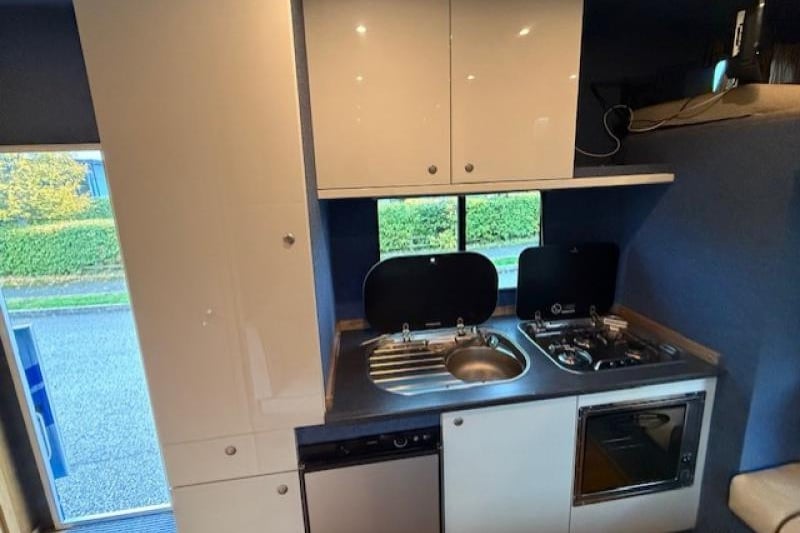 Inside, the smart living area offers L-shaped leather seating, a double luton bed, kitchen with oven, hob, sink, and fridge, TV, and a fully equipped bathroom with shower and toilet. The horse area is light, spacious, and well-ventilated with adjustable padded partitions, strong rubber flooring, and excellent headroom.