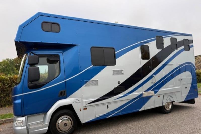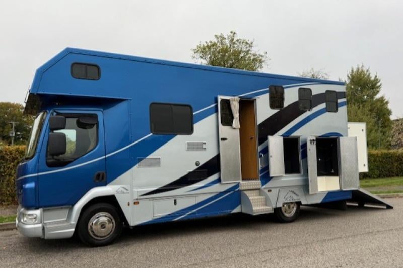 Beautifully presented 2012 DAF LF 7.5T Solitaire Sapphire 3 horsebox, stalled for three with luxurious living for four. Built to a high standard and in pristine condition throughout, it features a 170 BHP 4.5 L diesel engine, manual transmission, and MOT to March 2026.