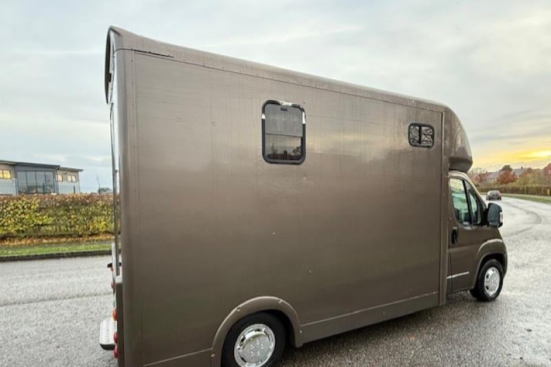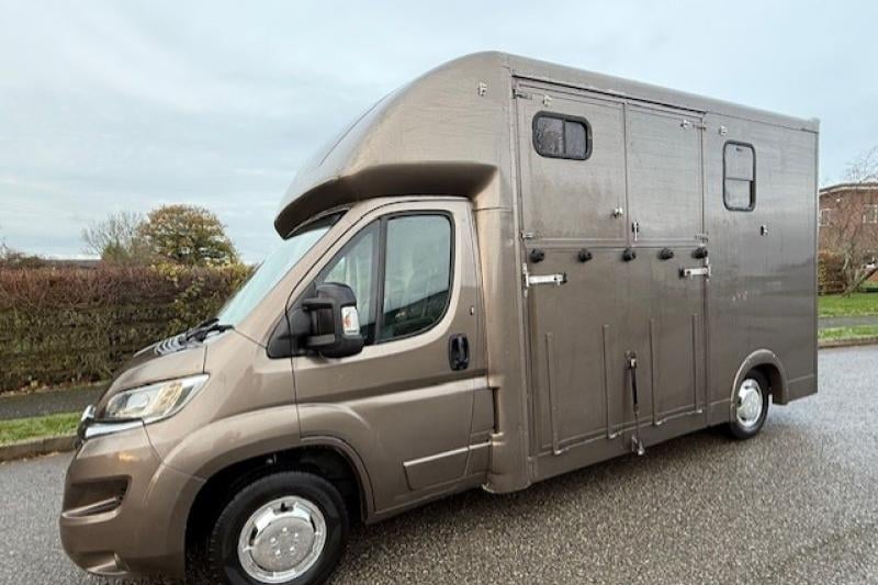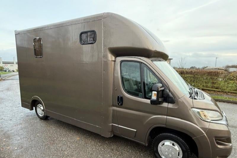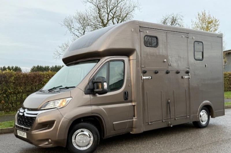 This 2016 Citroen Relay 3.5-ton horsebox, coach-built by Elite Coach Works, offers rear-facing stalls for two horses and is presented in excellent condition with a well-equipped cab and metallic bronze exterior. It features a comfortable living area, a light and reinforced horse compartment with an 8ft internal height, and practical touches throughout including CCTV, air-conditioning, composite roofing and a split side ramp.