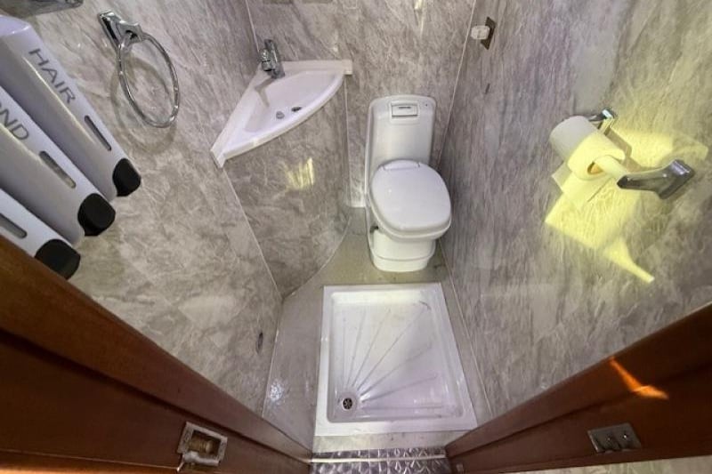 - Sleeping for one above the bathroom with fitted mattress (Manual sky light fitted in the ceiling)