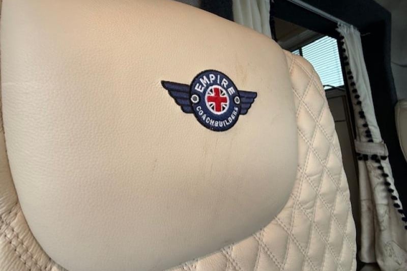 - Cream leather upholstered cab seating with Empire logo in the headrests