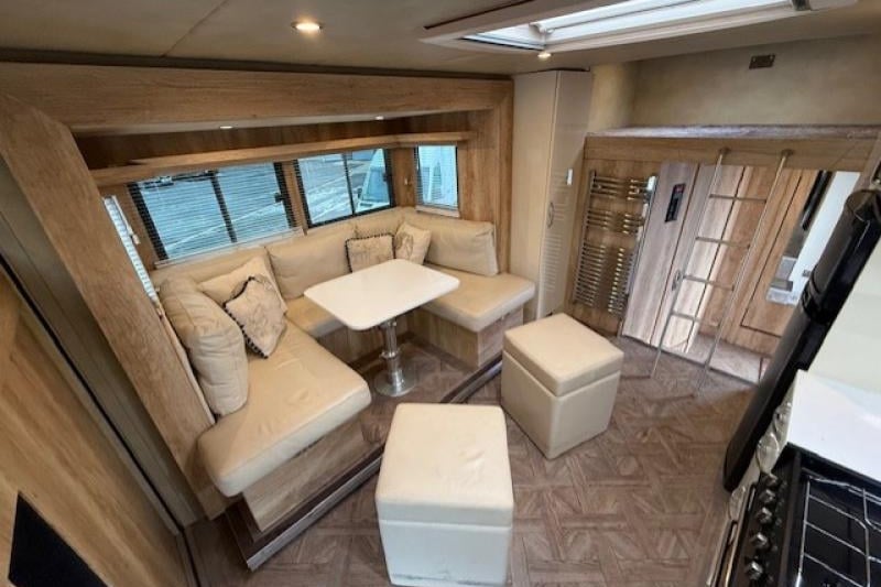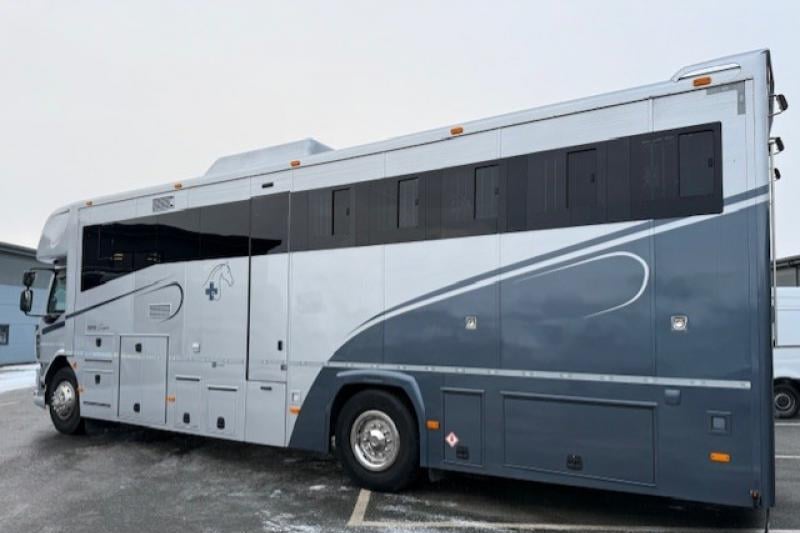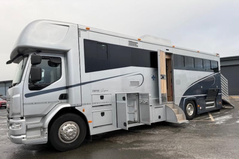 This 2017 DAF LF 18-tonne horsebox, professionally coachbuilt by Empire Coachbuilders, offers luxury living for six with a large electric slide-out, extensive underfloor storage, and EU certification. Designed to carry five large horses in a spacious, well-ventilated horse area, it combines a Euro 6 automatic chassis with high-end finishes, full bathroom facilities, and premium onboard systems throughout.