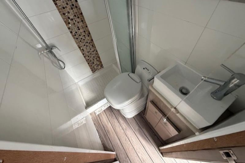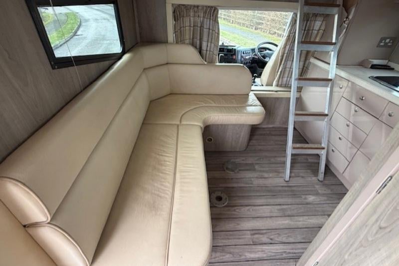 - Sleeping for two above the cab with fitted mattress and window either side of the luton